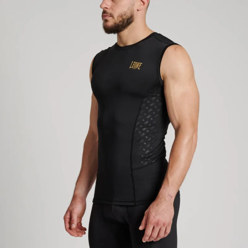 Características: camiseta de compressão DNA Leone 1947 fabricada em 100% poliéster e caracterizada por ser muito leve e confortável. Design em preto com logótipo Leone 1947 em dourado na parte da frente e nas costas. Sem mangas e gola redonda. Etiqueta com a bandeira da Itália. Estampados de alta qualidade e duradouros. Ideal para treinar no ginásio, ao ar livre ou para roupa casual.